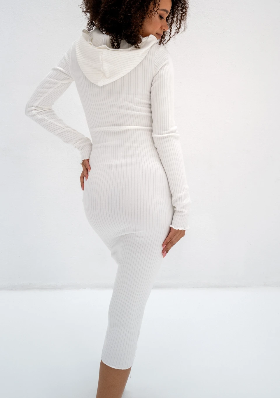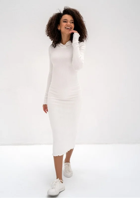 Wszechstronna sukienka bawełniana z prążkowanej dzianiny. Dopasowany model typu bodycon z praktycznym kapturem, w kremowym odcieniu bieli.