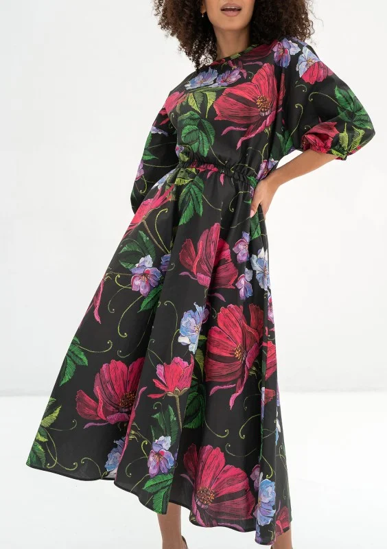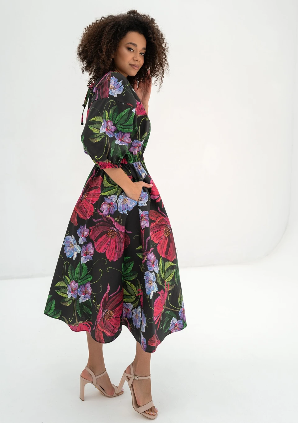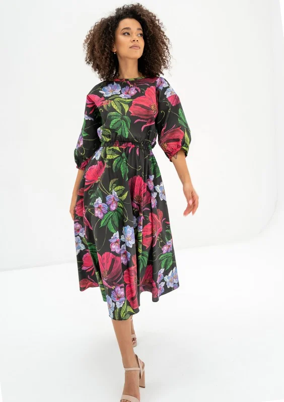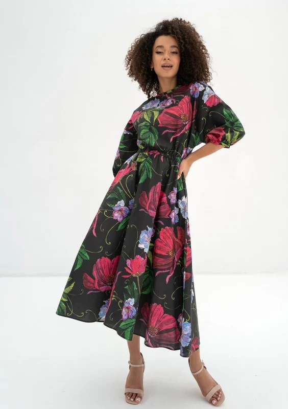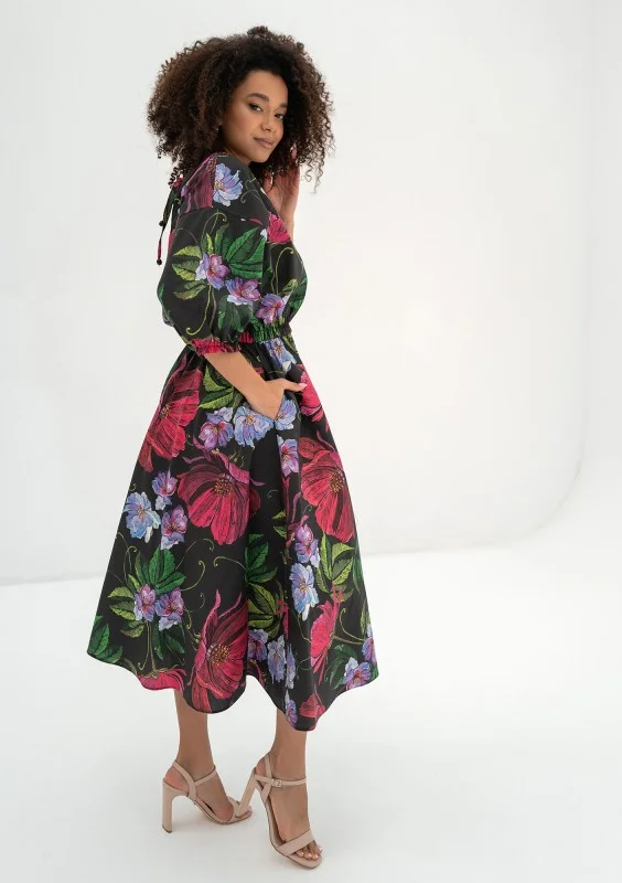 Rozkloszowana sukienka midi w głębokim odcieniu czerni z kolorowymi, wielobarwnymi kwiatami to absolutna kwintesencja elegancji z nutą wiosennej radości. Jej wyjątkowa tkanina zdobiona kwiatowym motywem dodaje uroku i wyrazistości każdej stylizacji. Sama sukienka emanuje subtelnym pięknem i szykiem, idealnie nadając się na różnorodne dzienne uroczystości wiosennej i letniej pory roku. Może być doskonałym wyborem na spotkanie rodzinne, letni piknik, przyjęcie w ogrodzie czy na letnią imprezę. Jej czarny kolor z kolorowymi kwiatami sprawia, że doskonale sprawdzi się również podczas wiosennych przyjęć na świeżym powietrzu, gdzie stanie się wyrazem elegancji i subtelności. Ta koktajlowa sukienka w kwiaty nie tylko podkreśla Twoją kobiecość i wyrafinowanie, ale także dodaje Ci pewności siebie i wdzięku, czyniąc Cię centralną postacią każdej dziennej uroczystości, na której się pojawisz.