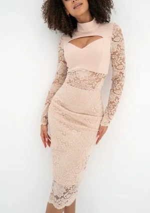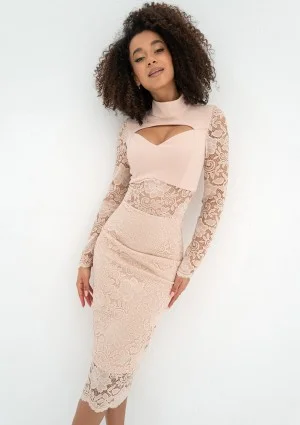 Fason midi, dopasowany, ze stójką i wycięciem na dekolcie, z długim rękawem.