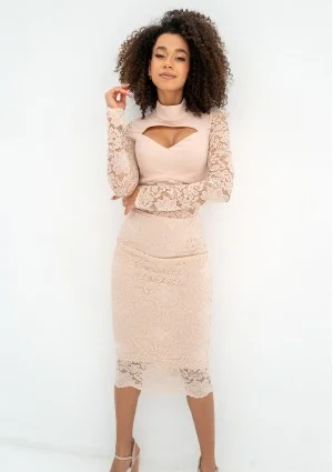 Suzane to wyrafinowana kreacja, dająca wrażenie dwuczęściowego kompletu pokrytego gustowną koronką. Ślicznie podkreśla wszelkie walory sylwetki, którą z dumą i pewnością siebie zaprezentujesz przy ważnych okazjach. Kreację dedykujemy na takie okazje jak rocznica, ważna kolacja czy jubileusz. Sprawdzi się w roli sukienki na wesele, przyjęcie komunijne czy eleganckie spotkanie towarzyskie.