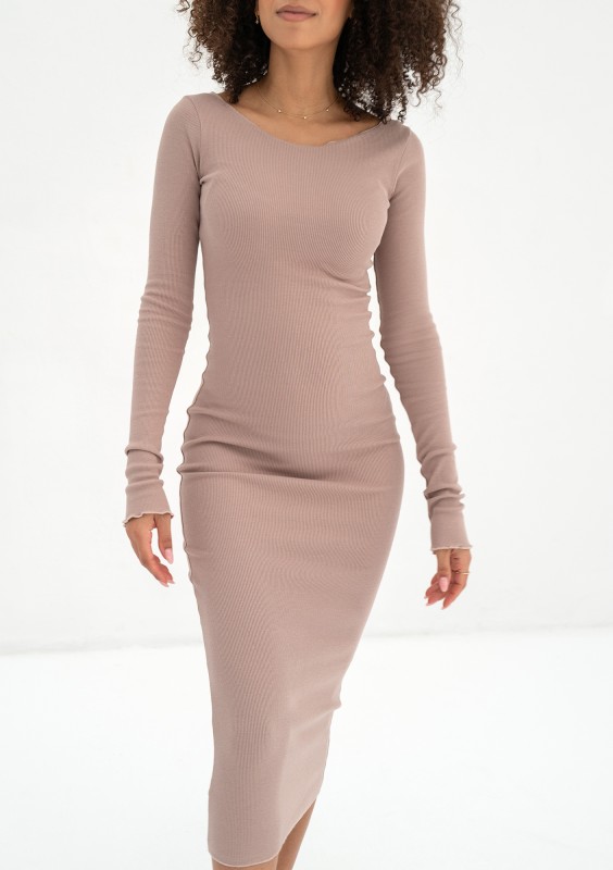 Bawełniana sukienka midi z prążkowanej dzianiny w kolorze beżu latte. Posiada fason o dopasowanej linii typu bodycon, delikatnie elastyczna.