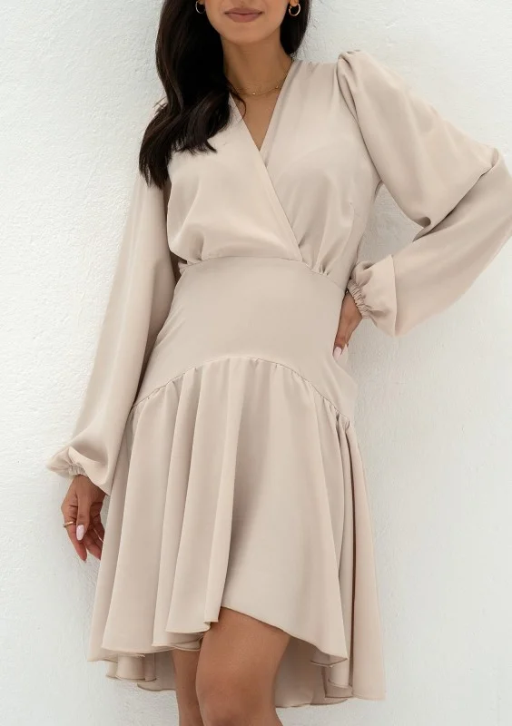 Koktajlowa sukienka z falbanką, kopertowym dekoltem i długimi rękawami. Wykonana ze zwiewnej tkaniny w beżowym kolorze.