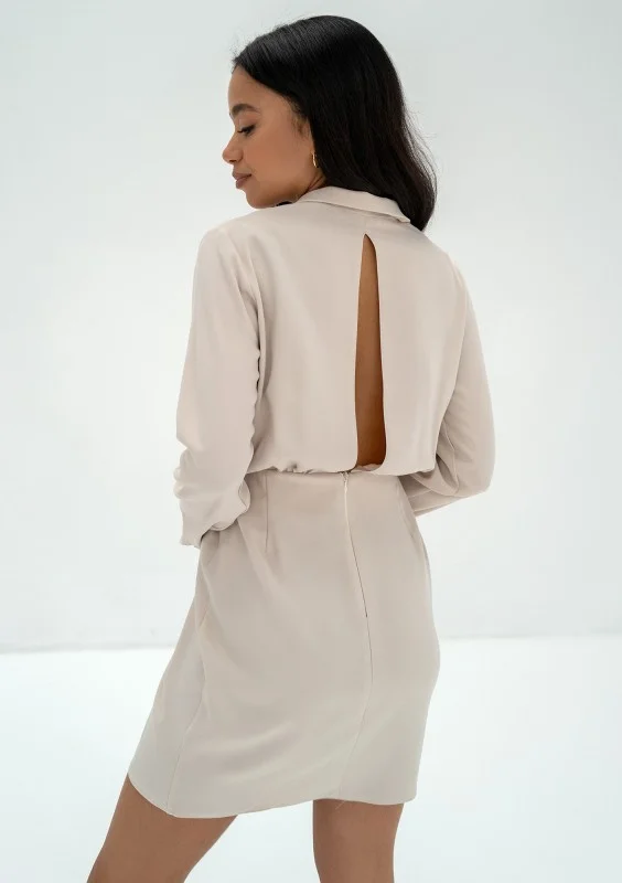 Beżowa sukienka koktajlowa mini o eleganckim kroju z kołnierzykiem i podłużnym wycięciem na plecach. Podkreśla atuty sylwetki!