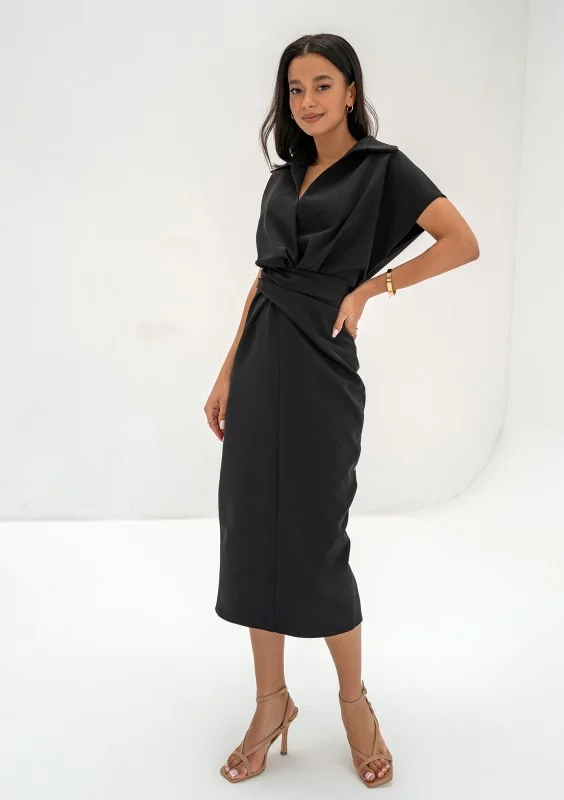 Axelle to czarna sukienka midi pełna klasy i wdzięku. Elegancki design został urozmaicony wiązaniem na skos, do tyłu.