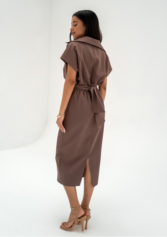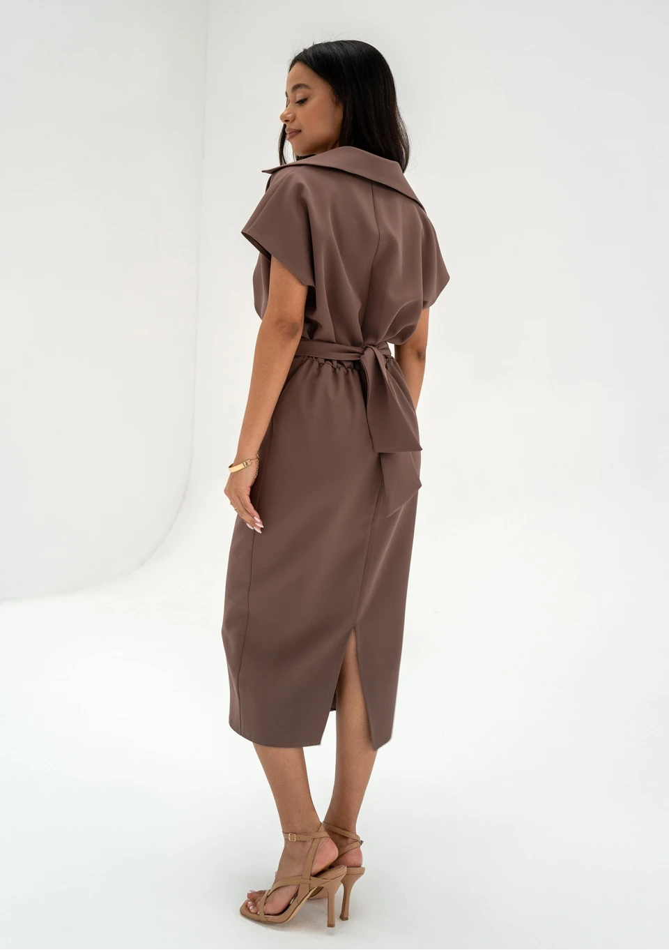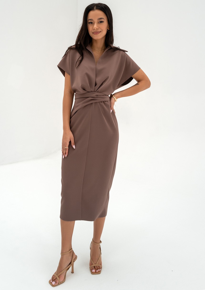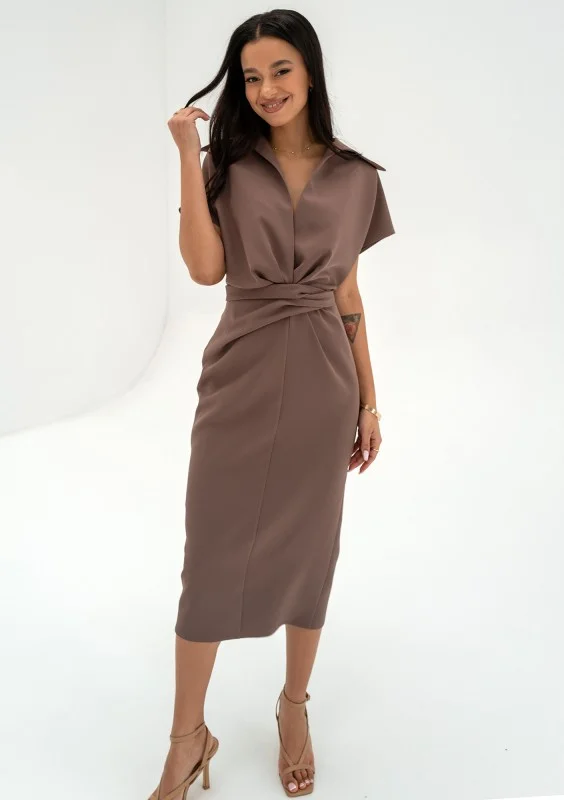 Brązowa sukienka midi o ołówkowym kroju, z luźno uformowanym kołnierzykiem. Draperia wiązania świetnie wysmukla talię. Prosty fason wizualnie wydłuża sylwetkę.