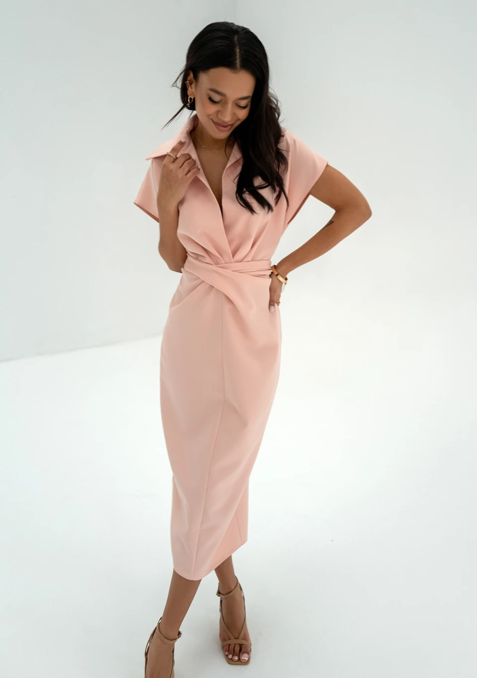 Fason midi, ołówkowy, z krótkim rękawem, kopertowym dekoltem, kołnierzykiem i wiązaniem z tyłu.