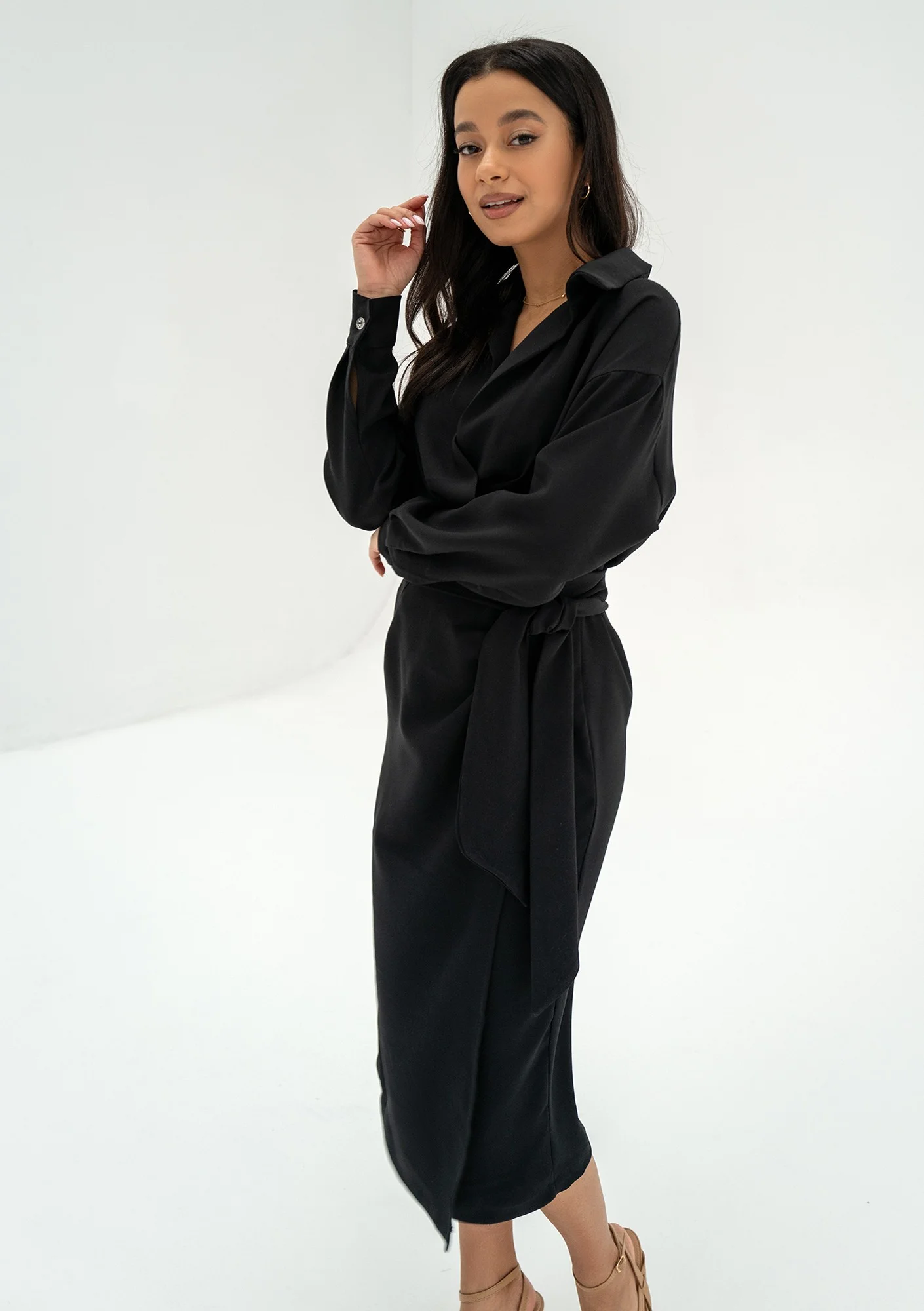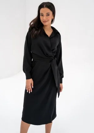 Fason midi, kopertowy, z wiązaniem w talii, długim rękawem i kołnierzykiem.