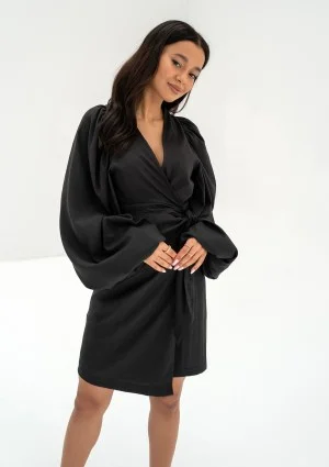 Fason mini, kopertowy, wiązaniem w talii i długim, luźnym rękawem.