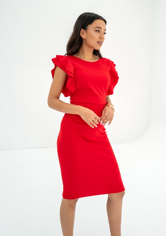 Czerwona sukienka o dopasowanym kroju, ozdobiona falbankami formującymi krótkie rękawki. Znakomicie podkreśla sylwetkę i dodaje seksapilu.
