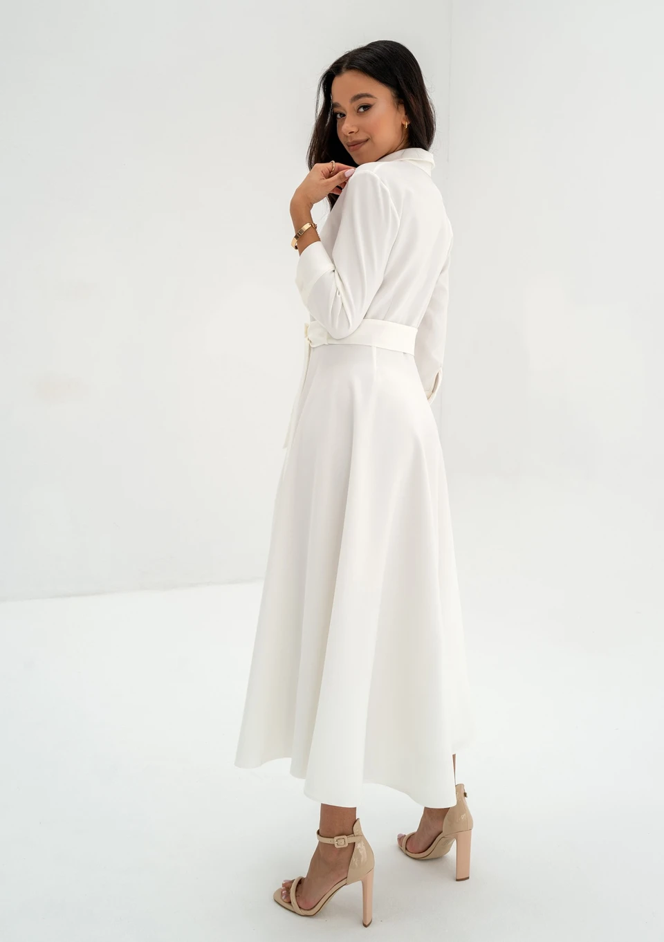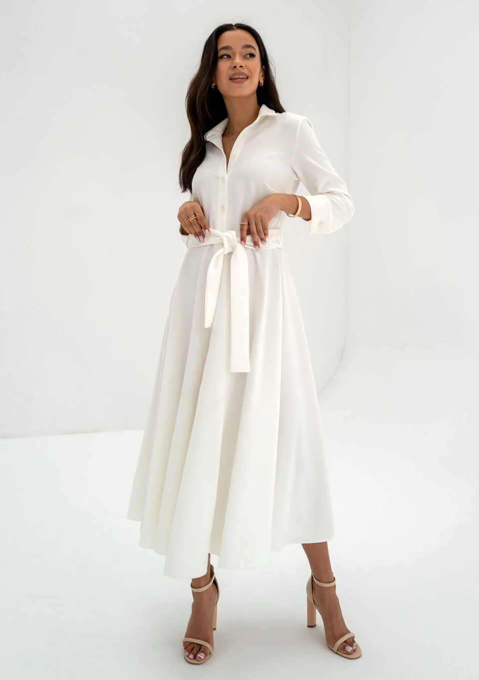Rozkloszowana sukienka koszulowa o długości midi, wykonana ze zwiewnej tkaniny w bieli ecru. Melody to modna sukienka o wszechstronnym zastosowaniu.