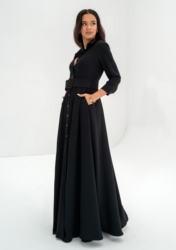 Rozkloszowana sukienka koszulowa maxi, wykonana ze zwiewnej tkaniny w czarnym kolorze. Posiada kieszenie i elegancki pasek z dużą ramką.