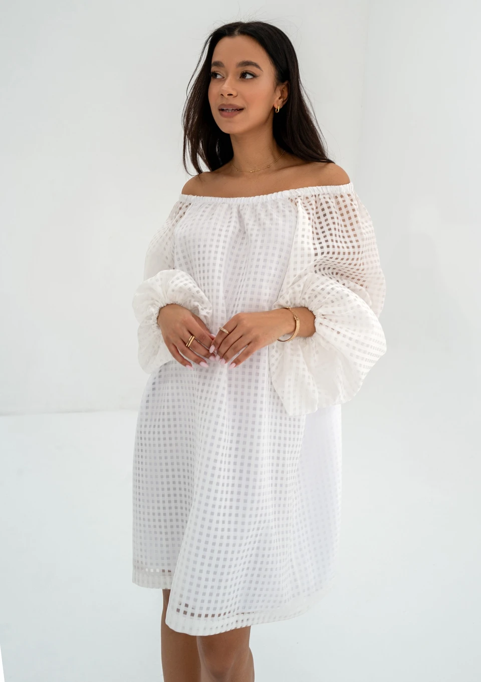 Fason luźny, w komplecie z paskiem, z dekoltem w łódkę i ażurową warstwą.