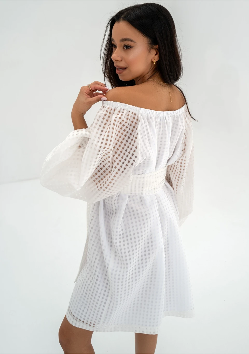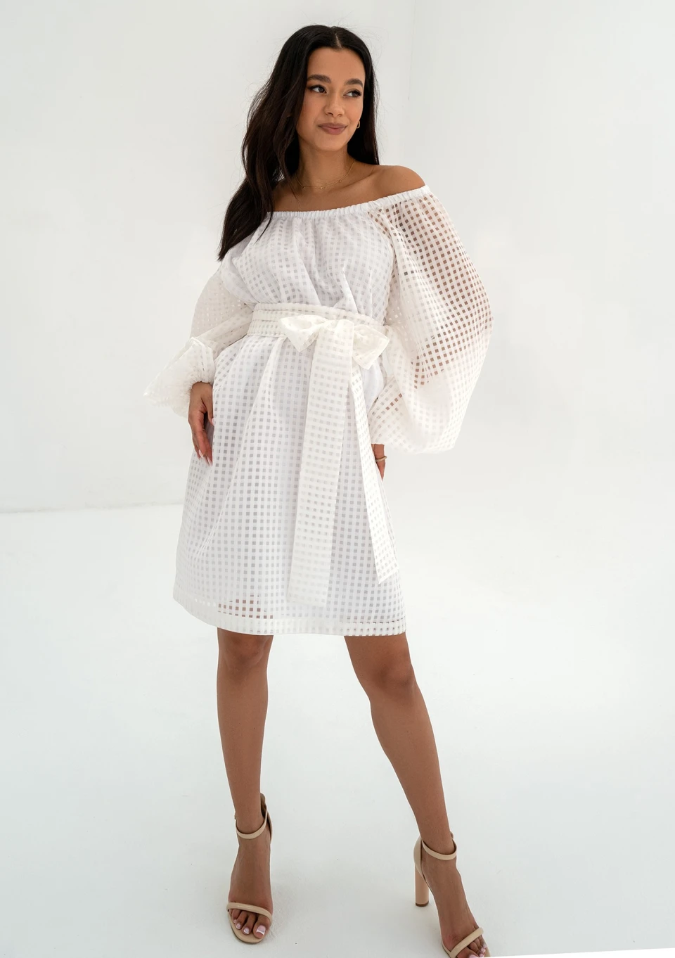 Biała sukienka letnia pokryta ażurowym materiałem. Może być noszona luźno, jak i z dołączonym paskiem.