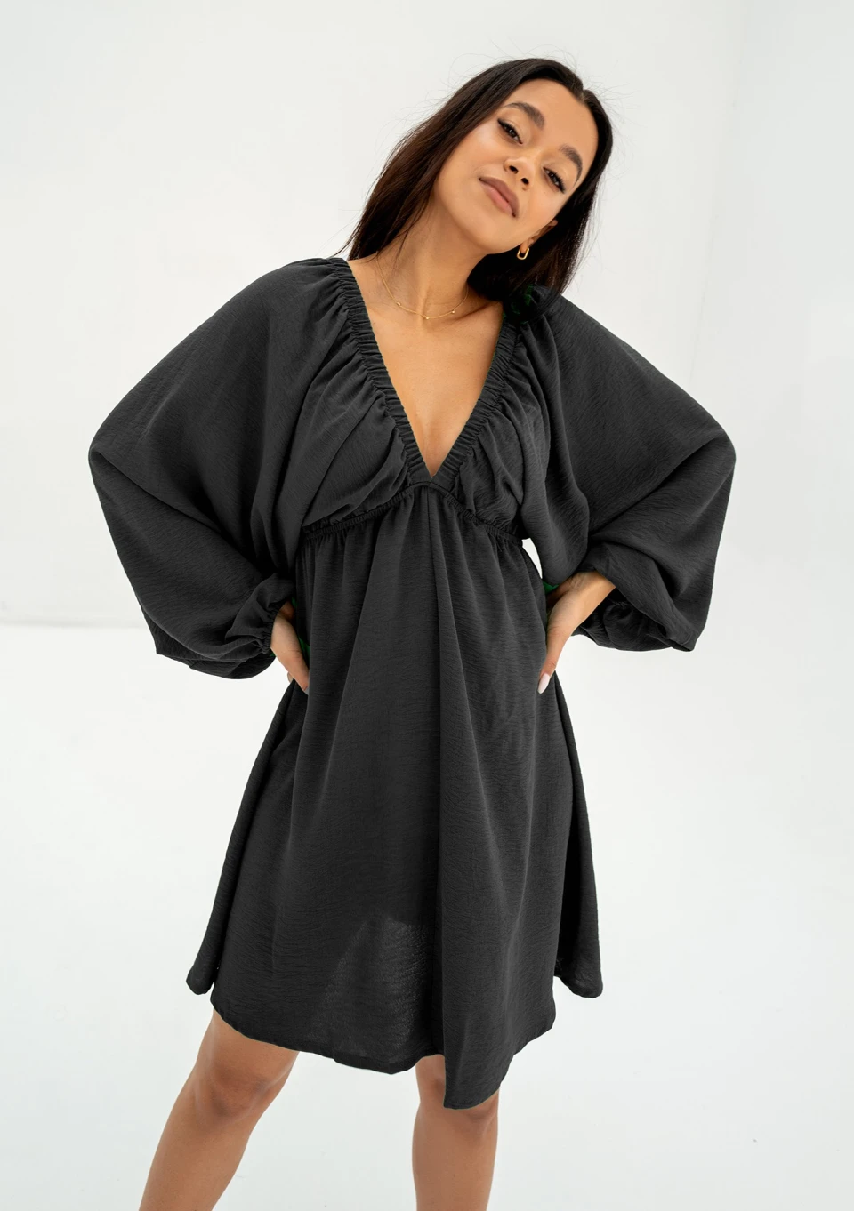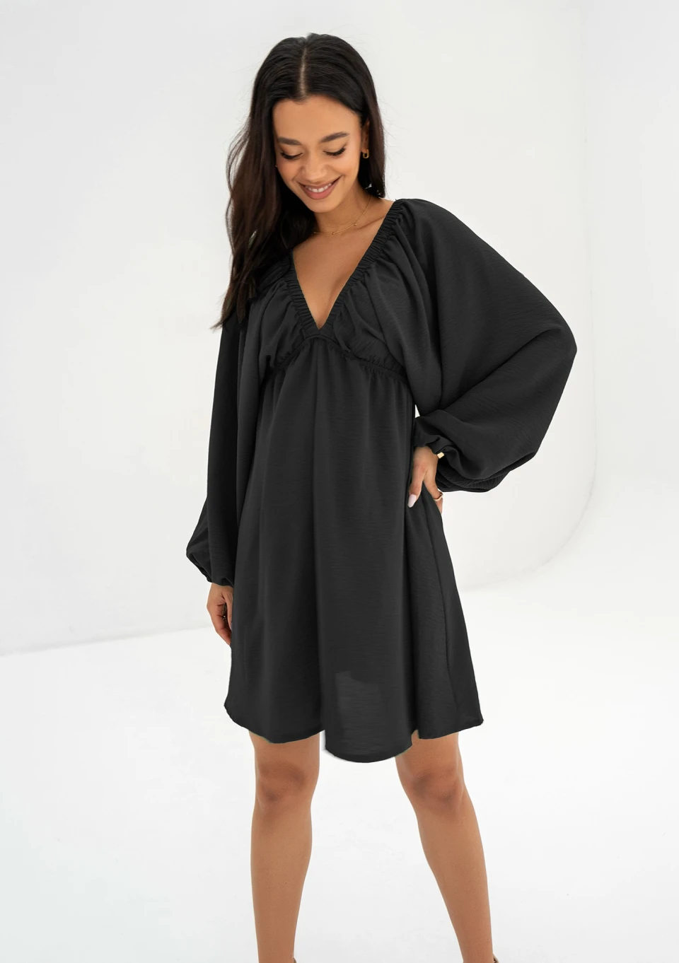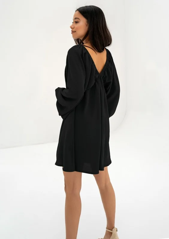 Zwiewna sukienka letnia w czarnym kolorze, z luźnym rękawem i gumkami tworzącymi odcięcie pod samym biustem. Kreacja idealna na upały.