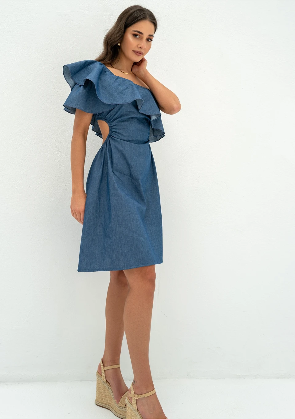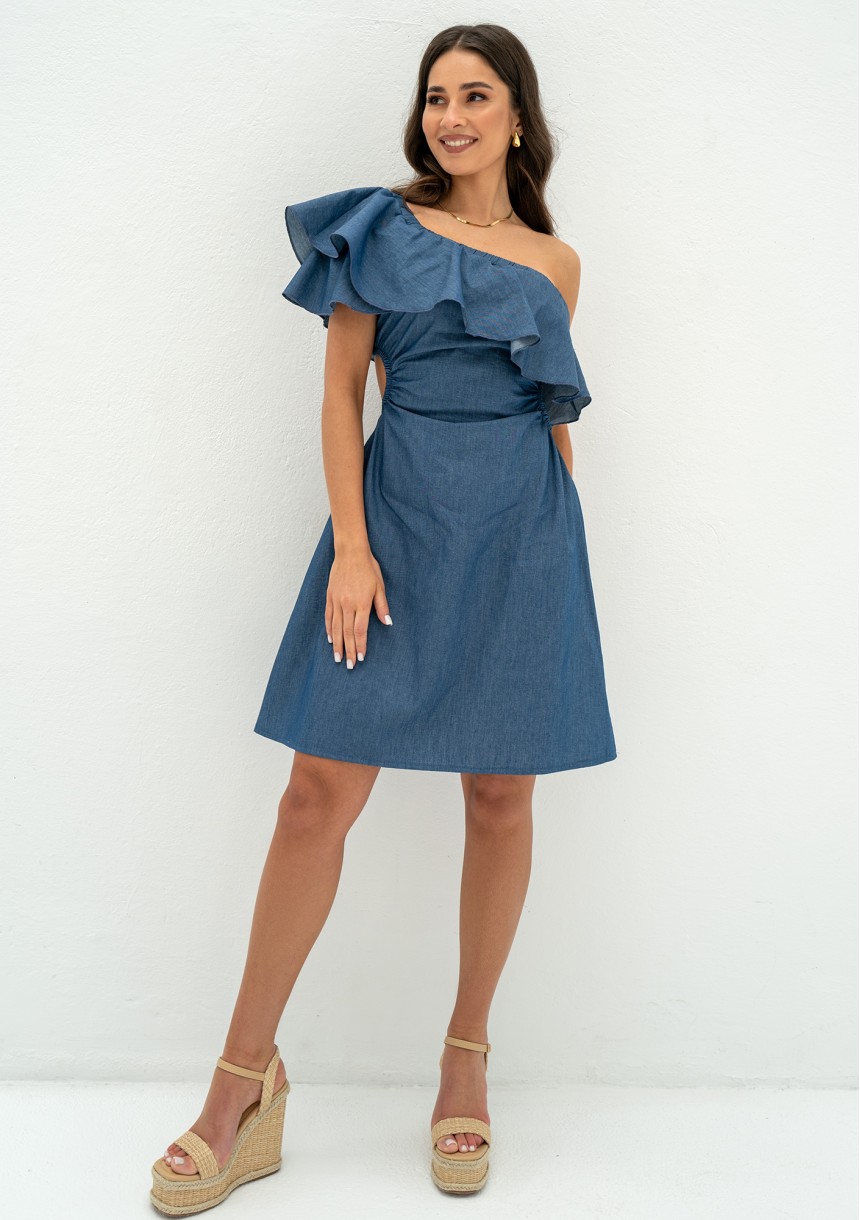 Koktajlowa sukienka z falbanką na linii dekoltu, cudnie uformowanym na jedno ramię. Kreacja mini z tkaniny bawełnianej w kolorze ciemnego jeansu. Subtelnie eksponuje plecy.