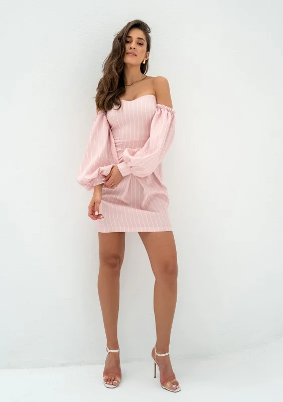 Wyrafinowana sukienka mini o tulipanowym kroju z gorsetowym dekoltem i dodającymi uroku rękawkami. Wykonana w pudrowym kolorze z drobnymi prążkami.