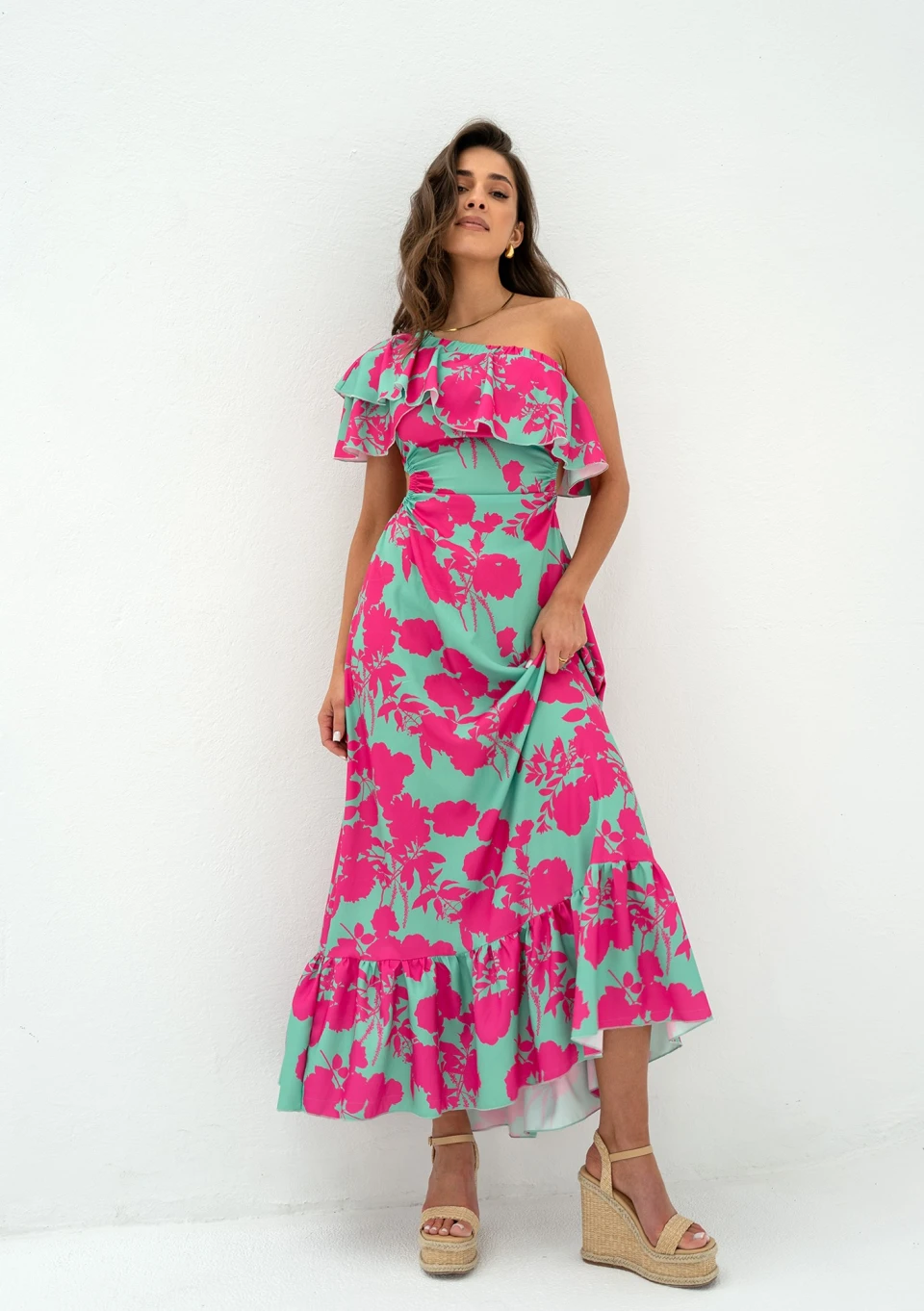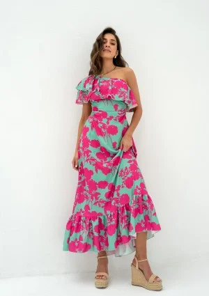 Koktajlowa sukienka midi skąpana w malowniczej kolorystyce turkusu i różu, emanuje letnią radością i pełnym romantyzmu stylem. Z falbanką wzdłuż dekoltu i stylowym wycięciem na plecach, dodaje subtelnego wdzięku. Ta wyjątkowa sukienka na jedno ramię będzie idealna na letnie przyjęcia koktajlowe i romantyczne wieczory pod gwiazdami. Perfekcyjnie spełni rolę oryginalnej i nietuzinkowej sukienki na wesele.