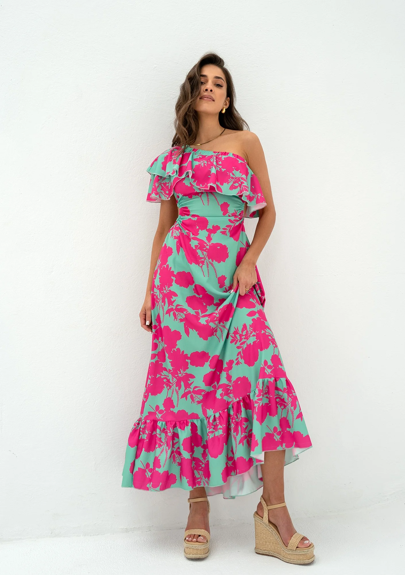Fason midi, rozkloszowany, z falbanką, na jedno ramię.
