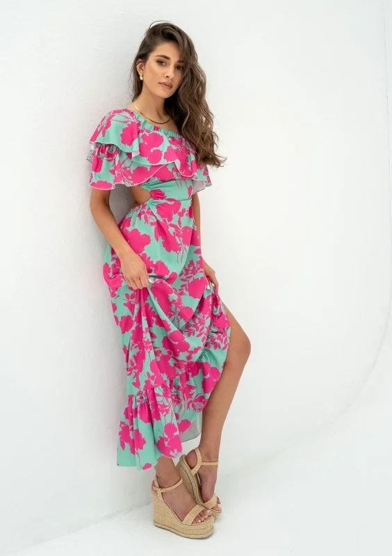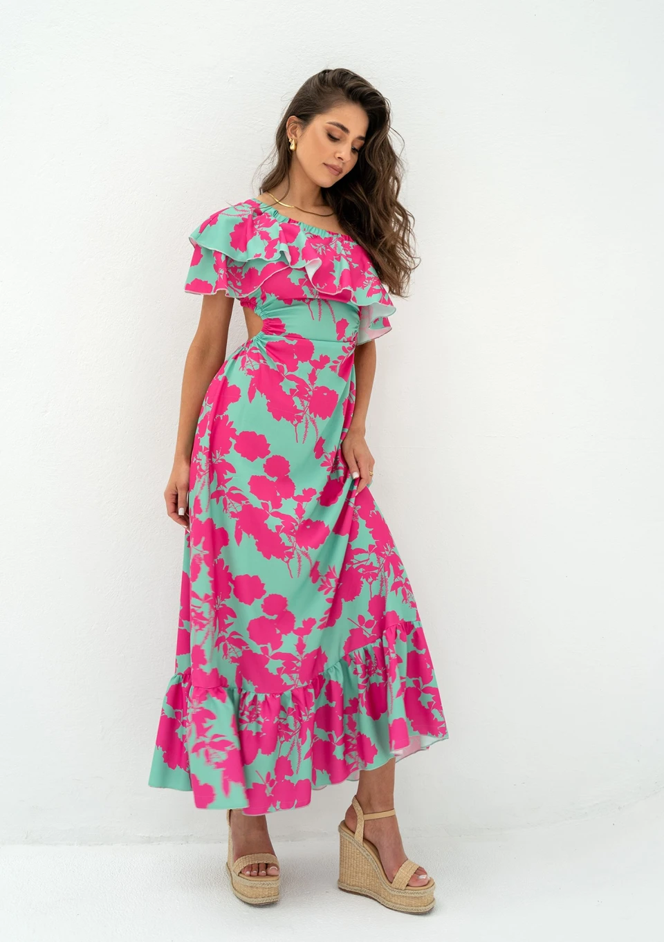 Koktajlowa sukienka letnia w kwiaty z modną, kontrastową kolorystyką turkusu i różu. Hiszpańska falbanka dodaje uroku. Kreacja subtelnie odkrywa plecy.