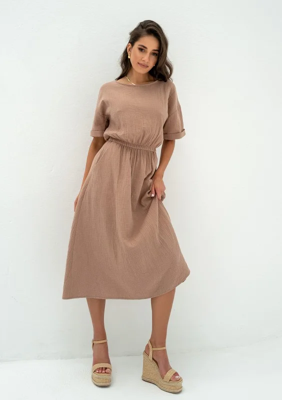 Komfortowa i wszechstronna sukienka letnia z muślinu w beżowym kolorze, wykonana w rozkloszowanej formie z krótkim rękawem, kieszeniami i wygodną gumką.