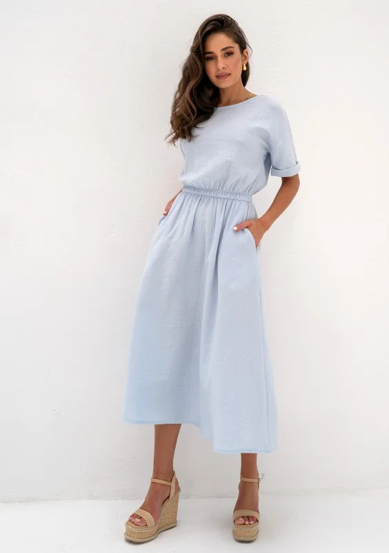 Letnia sukienka midi z muślinu w błękitnym kolorze, wykonana w rozkloszowanej formie z krótkim rękawem i gumką podkreślającą wcięcie sylwetki.