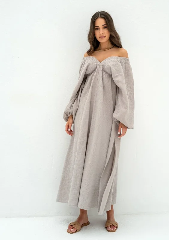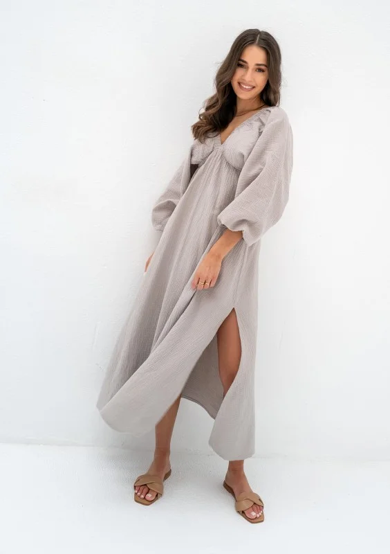 Fason midi/maxi, z długimi rękawami i odcięciem pod biustem.