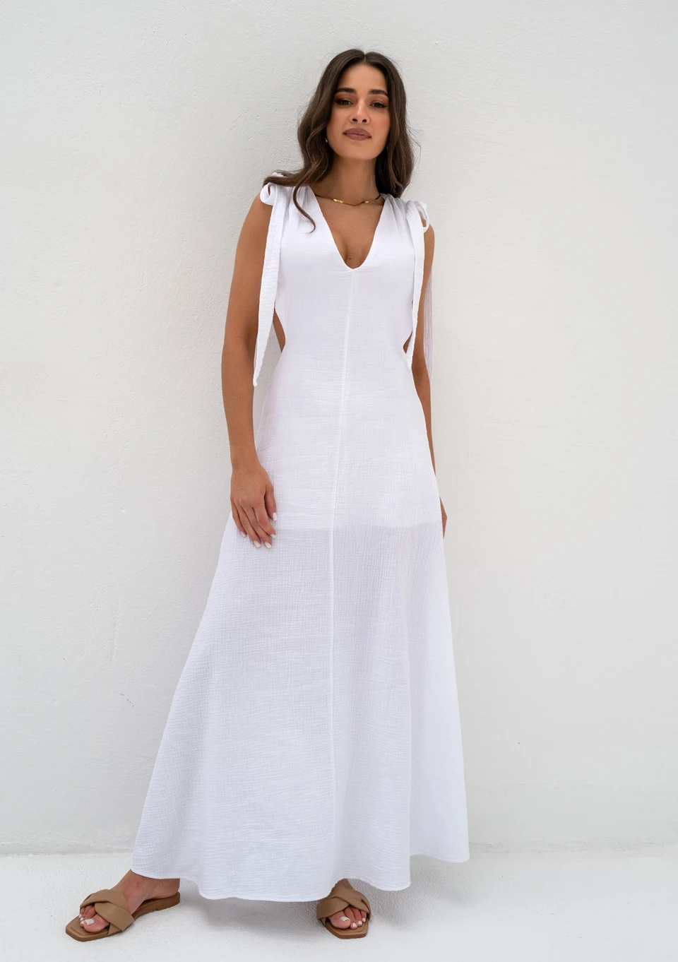 Biała sukienka maxi boho, w całości z naturalnej bawełny. Zwiewny materiał w postaci muślinu. Idealna kreacja na pełne słońca dni.