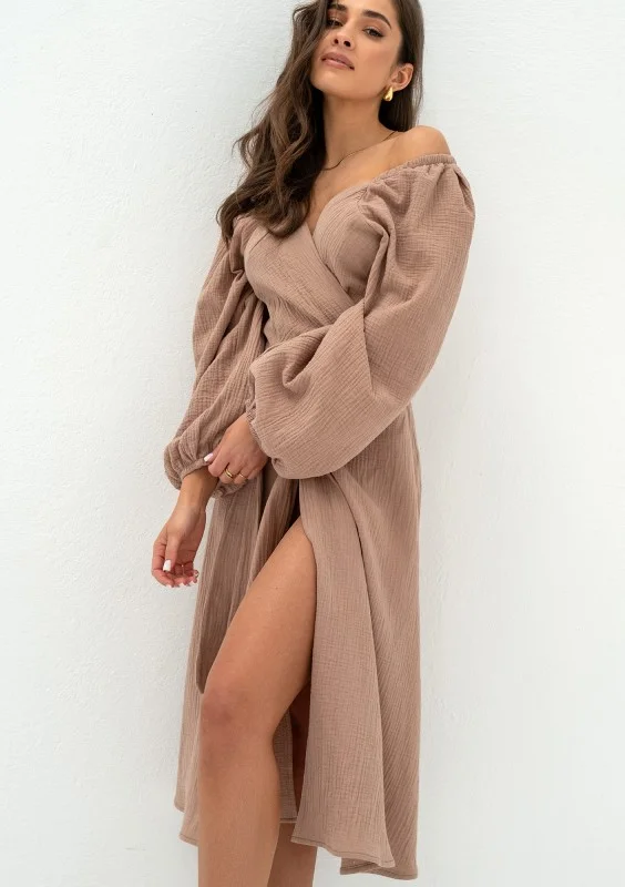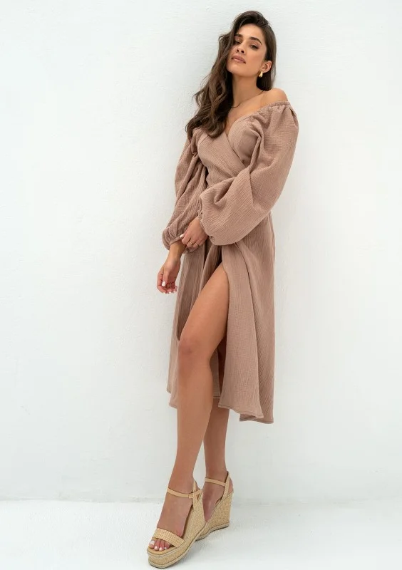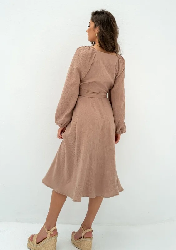 Muślinowa sukienka kopertowa, w całości wykonana z naturalnej bawełny w beżowym kolorze. Zwiewna kreacja z wiązaniem i długim rękawem.