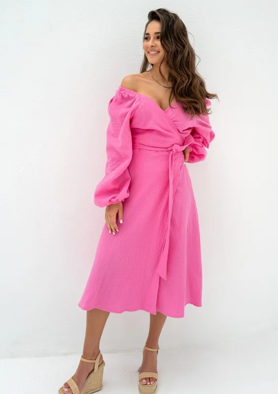 Letnia sukienka o kopertowym kroju midi. Zmysłowy róż kreacji doda świeżości i uroku! Posiada długie, swobodne rękawy z gumeczkami. Można je osuwać poniżej ramion.