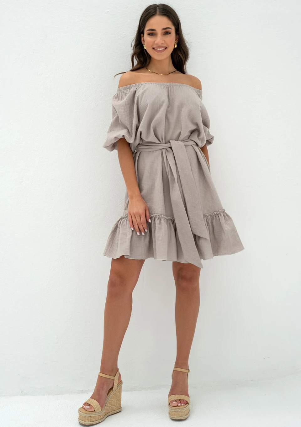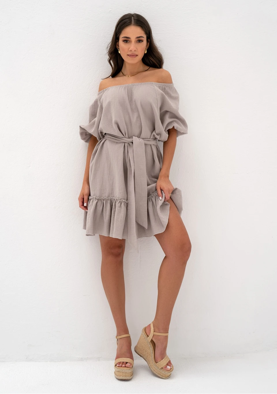 Letnia sukienka z dekoltem w łódkę i dodającą uroku falbanką. Model w naturalnej kolorystyce taupe, wykonany ze zwiewnego muślinu.