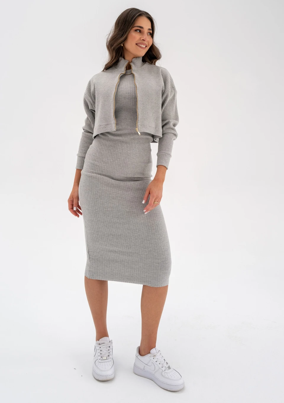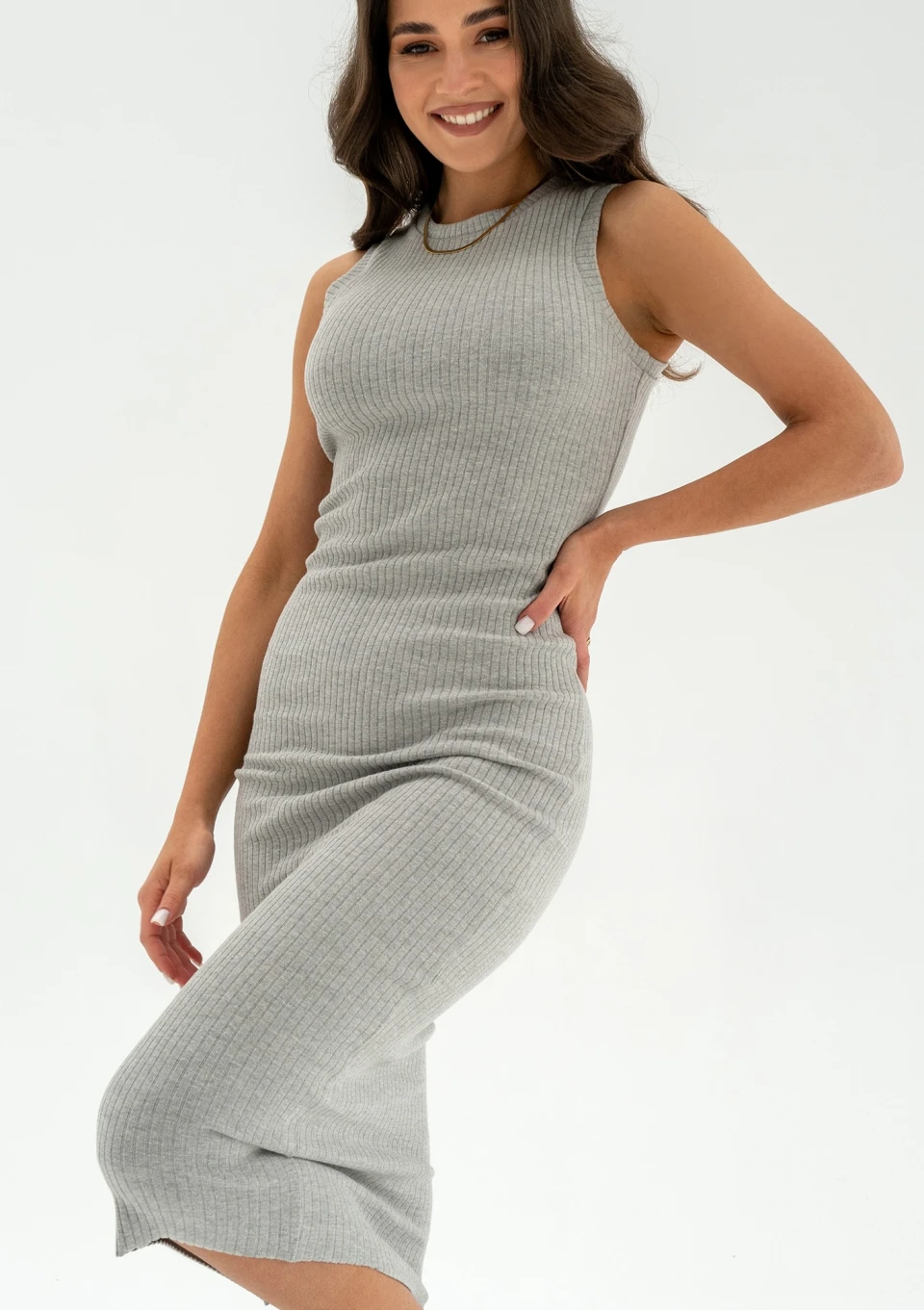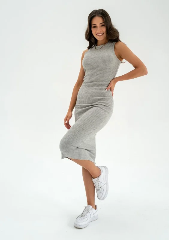 Klasyczna sukienka dzianinowa bodycon z bawełny w szarym kolorze. Delikatnie elastyczny materiał wygodnie dopasowuje się do sylwetki.