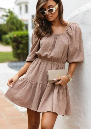 Ta zwiewna sukienka na lato wykonana jest z bawełnianej tkaniny muślinowej, która jest niezwykle przewiewna i lekka. Fason posiada luźne rękawy i rozkloszowany styl dolnej części, zachowując przy tym lekkość swojej formy. W pasie umieszczono elastyczną gumkę, która podkreśla talię, nadając sylwetce pożądany kształt. Sukienka boho wyposażona jest w rękawy o długości ¾, które można nosić na dwa sposoby: założone na barki tworzą efektowne bufki, natomiast osunięte na ramiona prezentują subtelną ułożoną linię, eksponującą całą obręcz barkową.