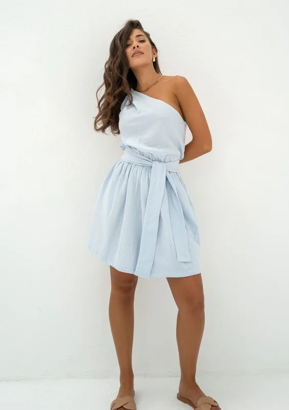 Zwiewna sukienka mini na lato w błękitnym kolorze. Lekka kreacja z dekoltem na jedno ramię, wygodnymi kieszeniami i wiązaniem, uszyta z naturalnego muślinu.