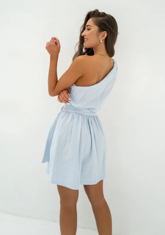 Kori - Sukienka mini na jedno ramię z muślinu Błękitna