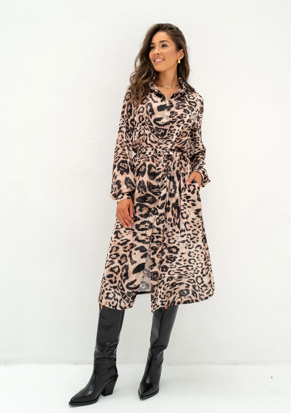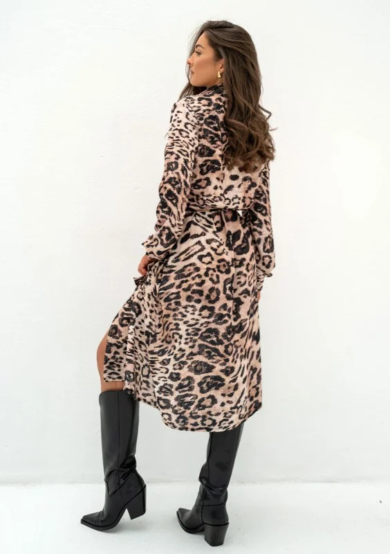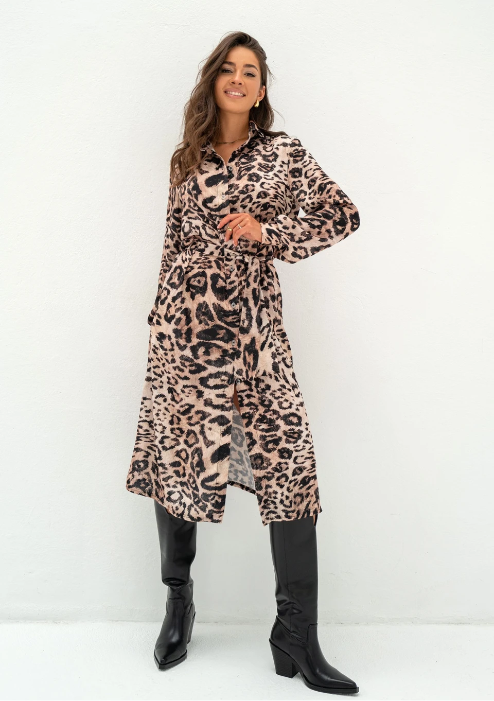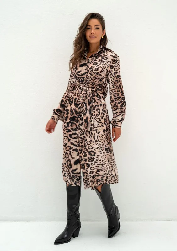 Stylowa sukienka koszulowa, wyrazista dzięki wzorowi panterki. Wszechstronna kreacja midi, z wiązaniem.