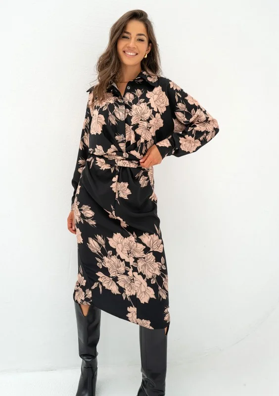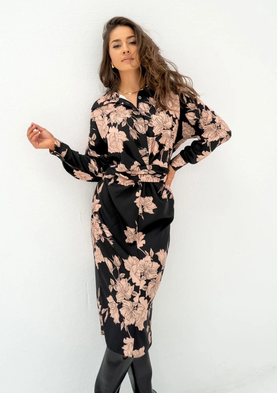 Piękna sukienka koszulowa z wiązaniem, zdobiona stylowym wzorem róż. Doskonała w roli kreacji do pracy czy na oficjalne spotkania.