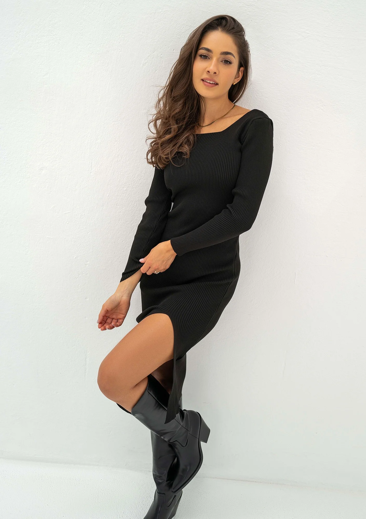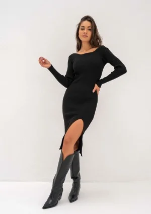 Fason midi, dopasowany, z kwadratowym dekoltem, długim rękawem i wycięciem na nodze.