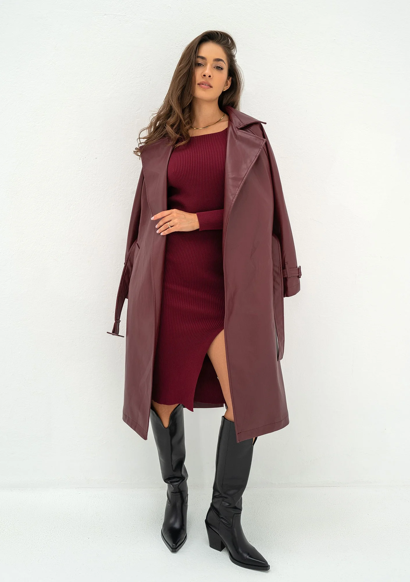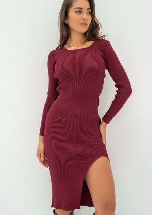 Bordowa sukienka jesienna z dzianiny prążkowanej szczególnie pasuje na chłodniejszą porę, świetnie uzupełniając sezonową kolorystykę stylizacji. Nasz model jest praktycznym i wszechstronnym rozwiązaniem - kreacja jest ponadczasowa, wygodna i pasuje do różnorodnych dodatków czy obuwia. Zmysłowo opływa sylwetkę, a wycięcie dodaje smaczku, jednak Shila zachowuje pełną elegancję i odpowiedniość na każdą okazję. Będzie stylową sukienką do pracy dla każdej kobiety, która lubi czuć się pięknie!