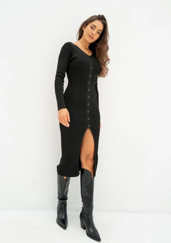 Czarna sukienka dzianinowa z rozcięciem i ozdobnym rzędem guzików. Wszechstronna, w stylu basic, idealna na przeróżne okazje.