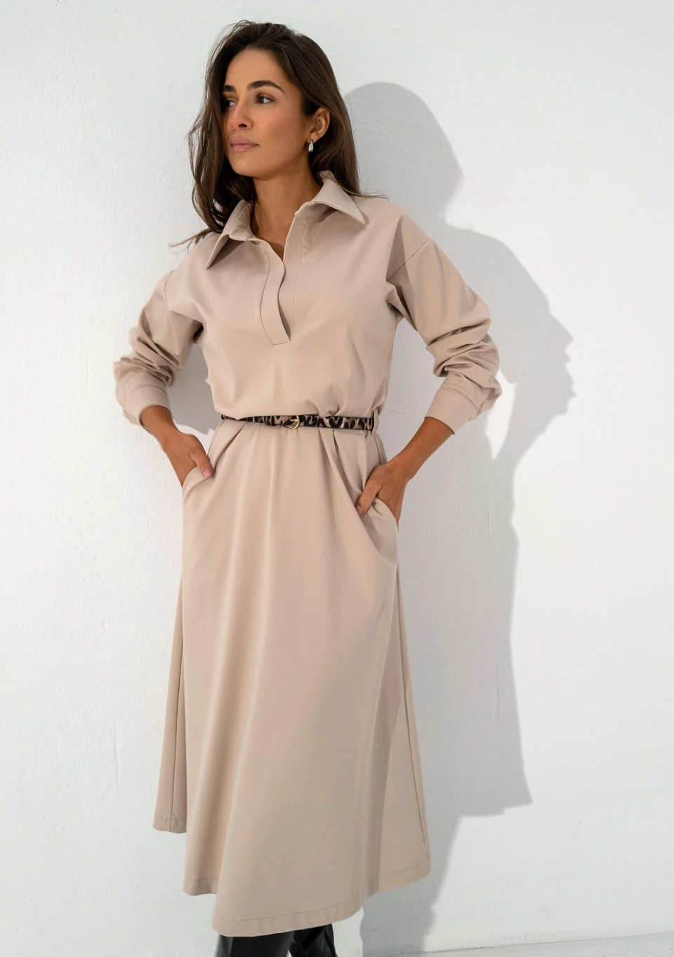 Beżowa sukienka midi o rozkloszowanym kroju, z długim rękawem, kołnierzykiem i wiązaniem w talii. Wyposażona w kieszonki.