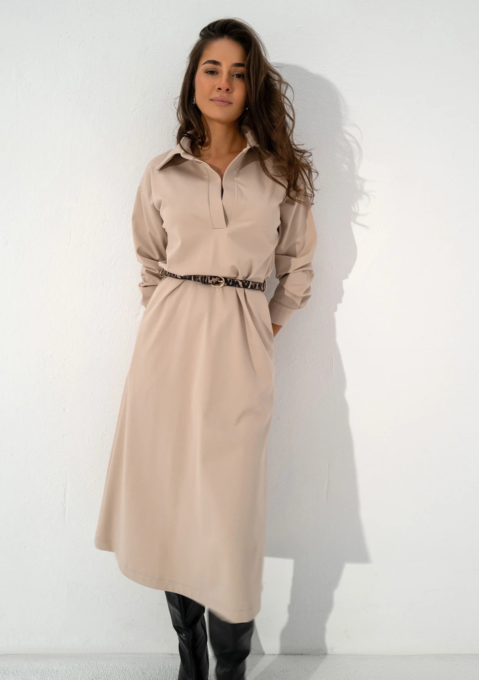 Klasyczna, pasująca na każdą okazję sukienka koszulowa midi z kołnierzykiem. Dla minimalistek! Będzie jedną z licznych stylizacji w tygodniu do biura czy popołudniową kawę, jak i na weekendowe okazje i małe uroczystości. Madeline jest prosta i wszechstronna, dowolnie stylizuj ją paskami i akcesoriami. Ta beżowa sukienka midi o rozkloszowanej formie została praktycznie wyposażona w kieszenie, a także szlufki, przez które możesz przeciągnąć pasek. Ten widoczny na zdjęciach, w cętki, nie jest elementem zakupu.