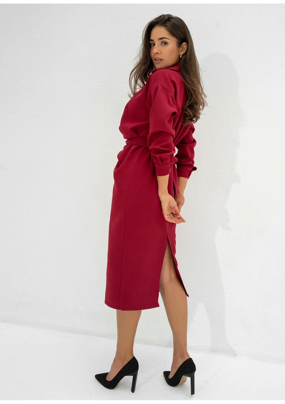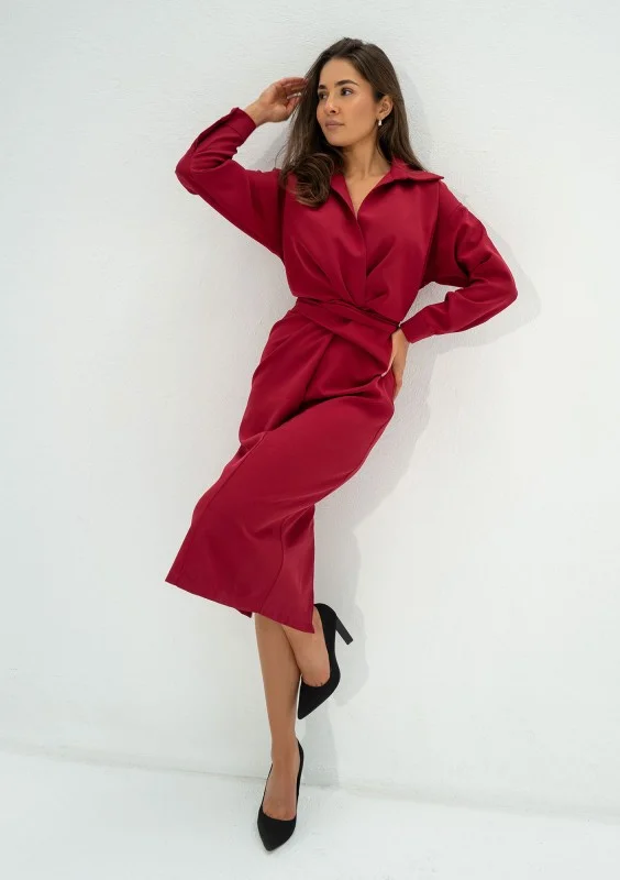 Czerwona sukienka za kolano z luźnym kołnierzykiem. Draperia świetnie wysmukla talię. Elegancki, ołówkowy fason tej kreacji idealnie pasuje na oficjalne spotkania i do pracy.