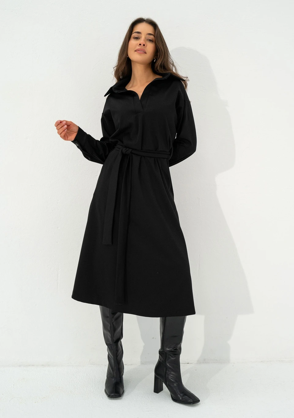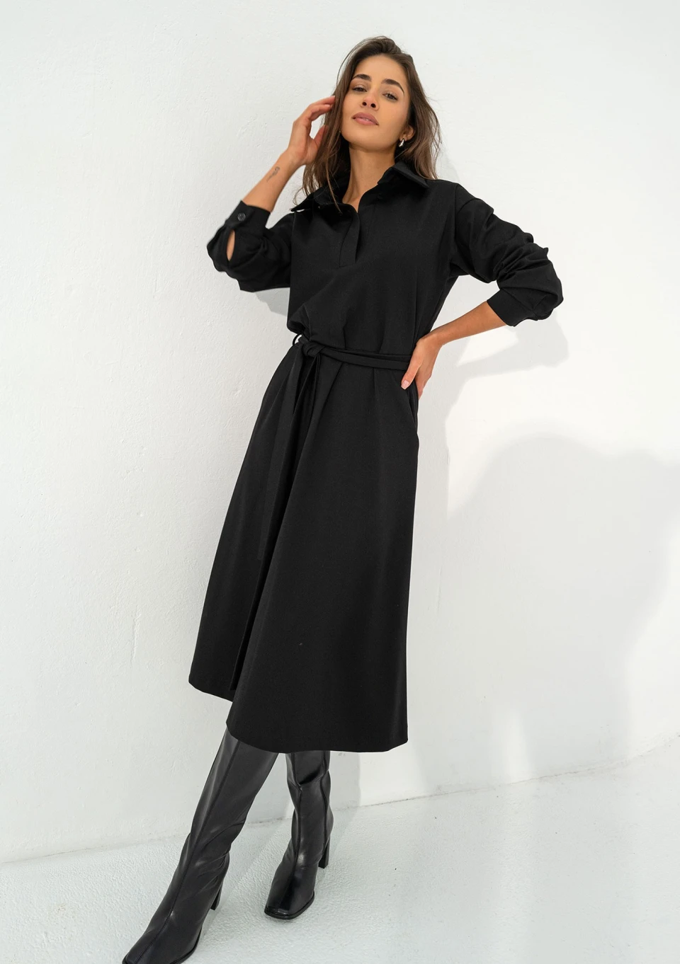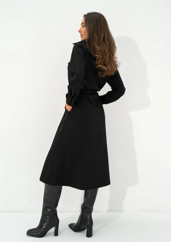 Czarna sukienka midi o rozkloszowanym kroju, z długim rękawem, kołnierzykiem i wiązaniem w talii. Wyposażona w kieszonki.
