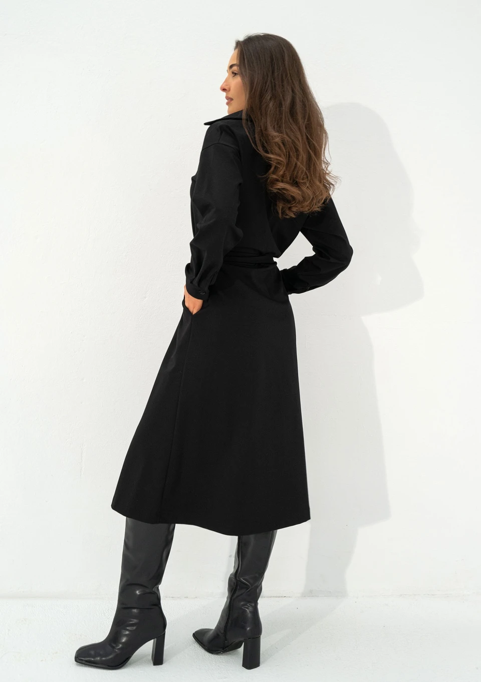Fason midi, koszulowy, rozkloszowany, z długim rękawem i wiązaniem w talii. Posiada kieszonki.