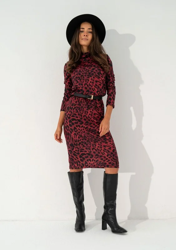 Sadie - Sukienka z golfem midi w panterkę Bordowa