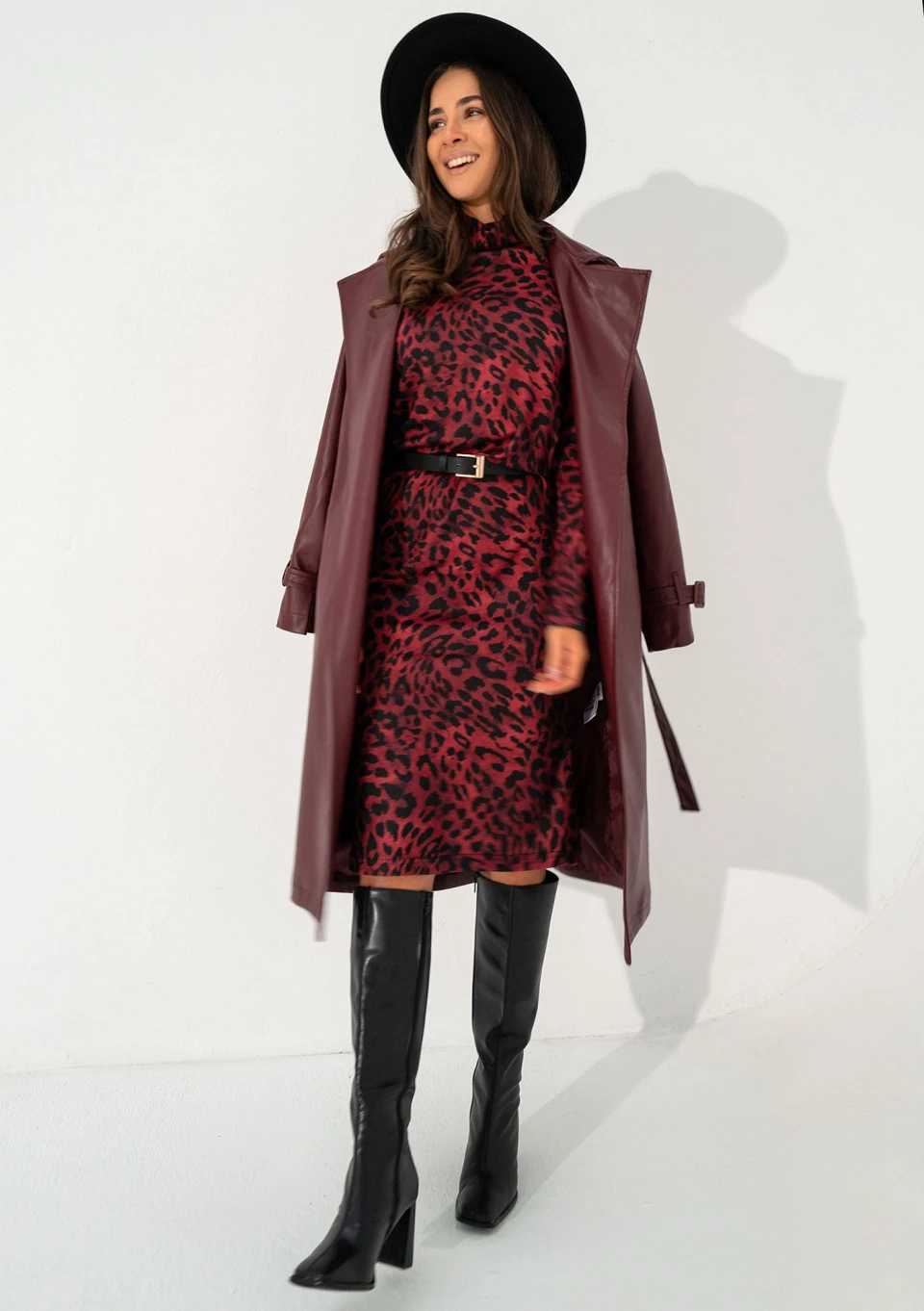 Bordowa sukienka w panterkę, wykonana z miękkiej dzianiny sweterkowej. Posiada wygodny fason z długim rękawem i drobnym golfem.