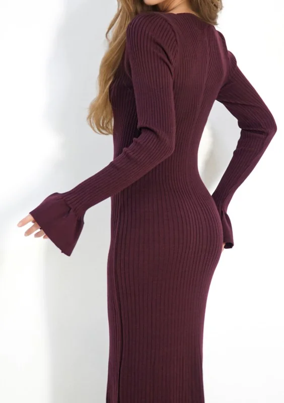 Długa sukienka z dzianiny w fioletowym odcieniu bordo obroni się przy każdej okazji, dbając o Twój szykowny wizerunek, jak i ciepło i wygodę w chłodniejsze dni. Wszechstronna, a zarazem wyjątkowa za sprawą pięknego koloru! Materiał sukienki jest bardzo przyjemny w odczuciu, a splot tworzy prążkowany wzór. Wyglądaj pięknie przy różnych okolicznościach - to sukienka do pracy i na popołudniowe spotkania, a nawet na drobne uroczystości rodzinne.