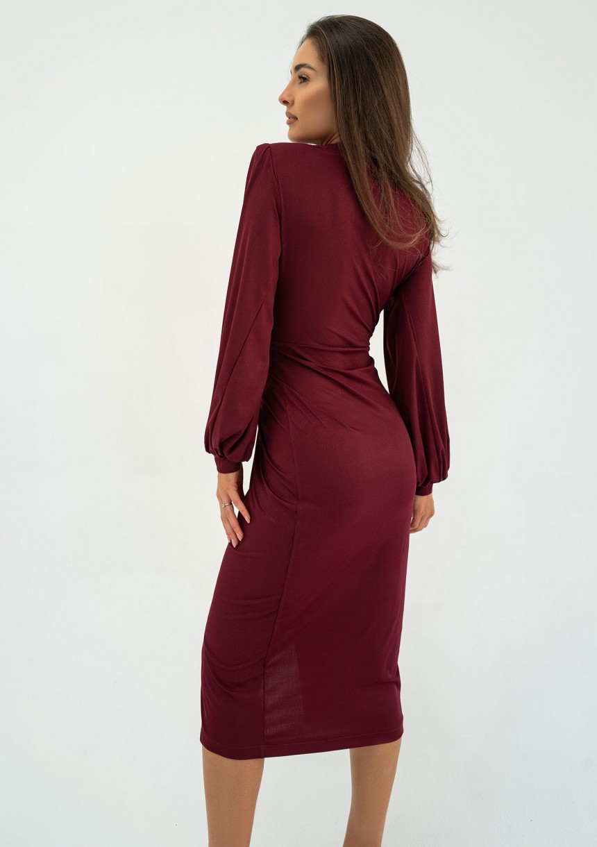 Bordowa sukienka wieczorowa z długim rękawem i wysmuklającą draperią. Wyjątkowa kreacja na specjalne okazje, z efektownie błyszczącej tkaniny.
