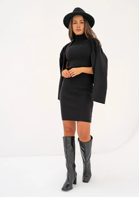 Klasyczna, czarna sukienka mini z miękkiej dzianiny z wiskozą. Idealnie dopasowuje się do sylwetki i podkreśla jej atuty. Niesamowicie wszechstronna!