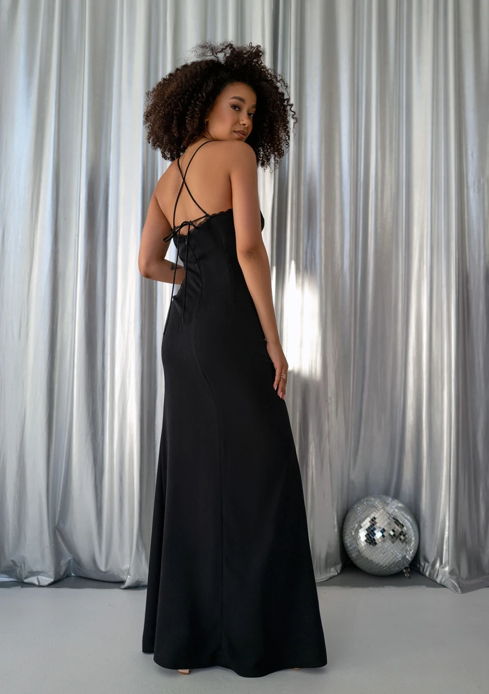 Shani to czarna sukienka na sylwestra, studniówkę, bal karnawałowy. Możesz wybrać ją jako sukienkę na wesele, o ile dress code uroczystości jest swobodny, a Ty komfortowo czujesz się w klasycznej czerni. Dzięki tej cudnej kreacji wyeksponujesz swoje atuty, linia syreny znakomicie zarysuje Twoją sylwetkę! Nasza sukienka wieczorowa odsłania plecy, na których wiąże się ramiączka.